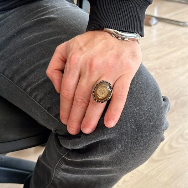 Kehribar Oluşturulmuş Taş ile tasarlanmış 925 Ayar Gümüş Erkek Yüzüğümüzle inancı ve zarafeti kucaklayın. Bu yüzük, İslami tasarım unsurlarını kehribarın güzelliğiyle birleştirerek, şifa ve sıcaklığın sembolünü oluşturur.