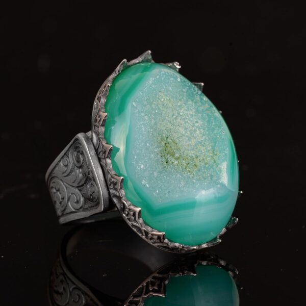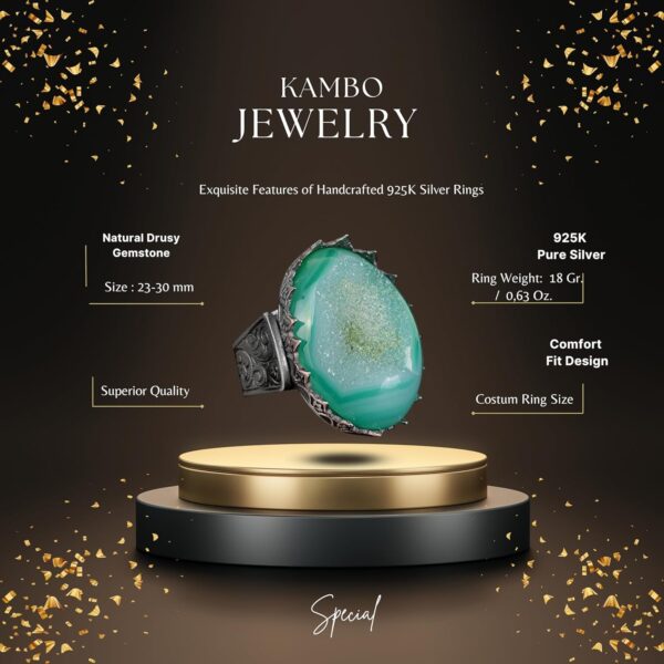 Özel Erkekler için King-Size 925 Ayar Gümüş Yüzük Koleksiyonumuzu tanıtmaktan mutluluk duyuyoruz; bu koleksiyon, Aqua, Yeşil ve Bej tonlarındaki doğal Druzy Kuvarsın çekiciliğini sunuyor. Bu yüzükler sadece aksesuar değil; doğanın sanatının bir kutlamasıdır ve cesur ve hırslı olanlara hitap eden bir tasarımda hayat bulmuştur. Her parça, yüksek kaliteli gümüş içinde yer alan gerçek Druzy Kuvars ile ustalığın bir kanıtıdır ve şıklığı ile doğayla olan bağı yansıtır. Dikkat çekmeyi seven ve hayattaki ince şeyleri takdir edenler için ideal olan bu koleksiyon, bir kral yüzüğünün özünü – güç, zarafet ve benzersizlik – temsil eder.