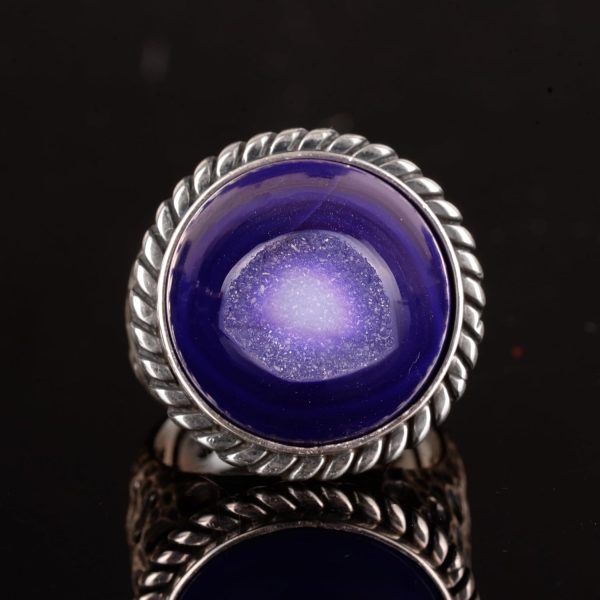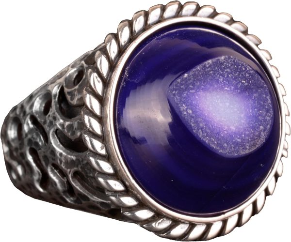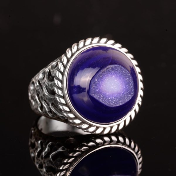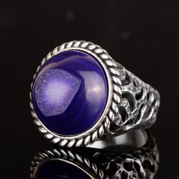 Erkekler için 925 Ayar Gümüş Yüzük, Doğal Druzy Kuvars: Mavi, Yeşil, Kırmızı Varyasyonlar (Mor)