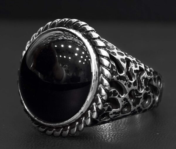 Bu muhteşem erkek yüzüğü, dayanıklılık ve sofistike bir parlaklık sunan kaliteli 925 ayar gümüşten üretilmiştir. Yüzük, derin siyah rengi ve koruyucu özellikleri ile bilinen etkileyici bir doğal oniks taşı ile süslenmiştir ve her kıyafet için güçlü bir ifade parçası haline gelmektedir.
