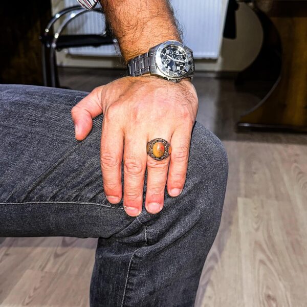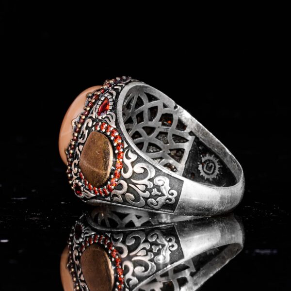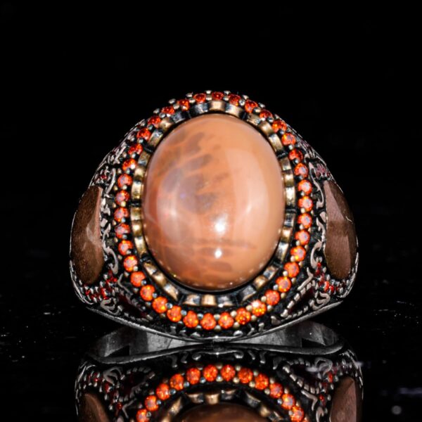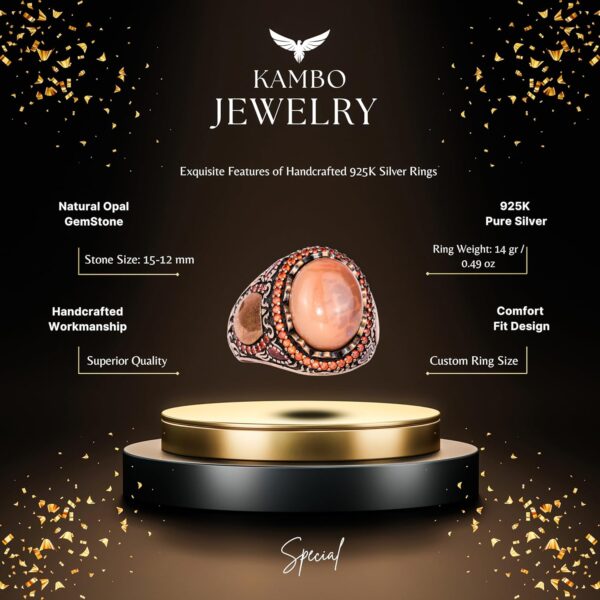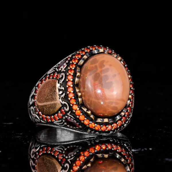 Bu muhteşem erkek yüzüğü, 925 ayar gümüş içine yerleştirilmiş gerçek bir doğal opal taşını sergilemektedir. Canlı renk oyunlarıyla opal taş, bu Sultan esintili tasarımın dikkat çekici merkez parçasını oluşturur. Kırmızı taş vurgularından cesur el işçiliği desenlerine kadar her detay, bu parçanın arkasındaki zanaatkarlığı gözler önüne seriyor.