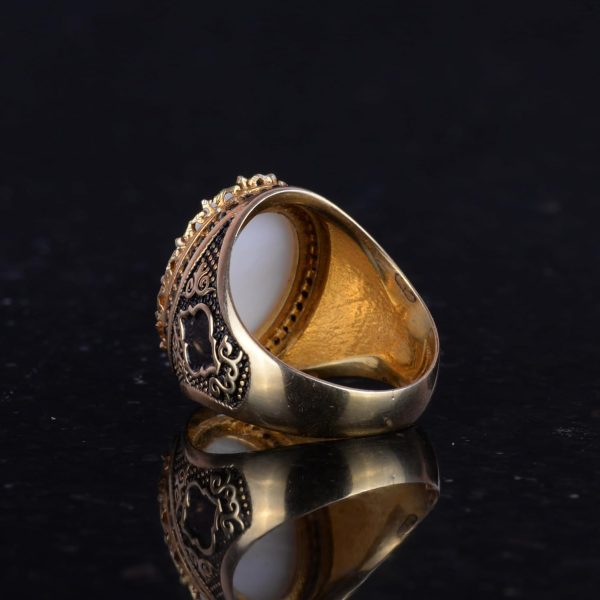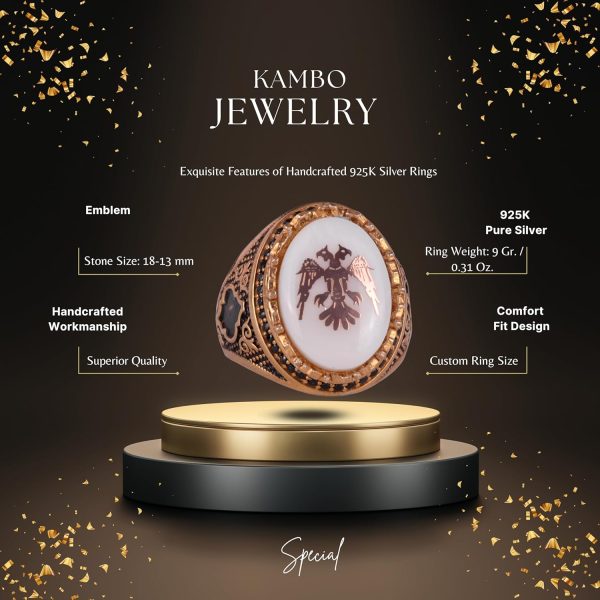Bu eşsiz erkek yüzüğü, güç ve görkemi simgeleyen detaylı bir iki başlı kartal tasarımına sahiptir. 925K katı gümüşten ve altın kaplamadan üretilen yüzük, zamansız zarafet ve kültürel önemi yansıtan karmaşık detaylarla süslenmiştir.