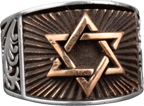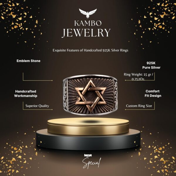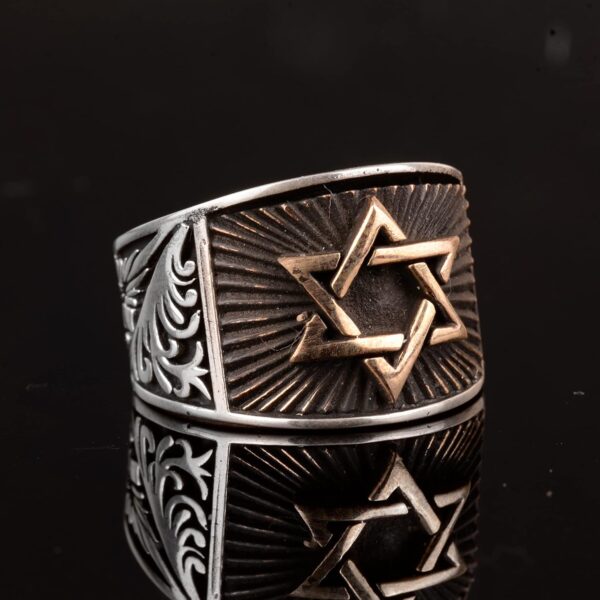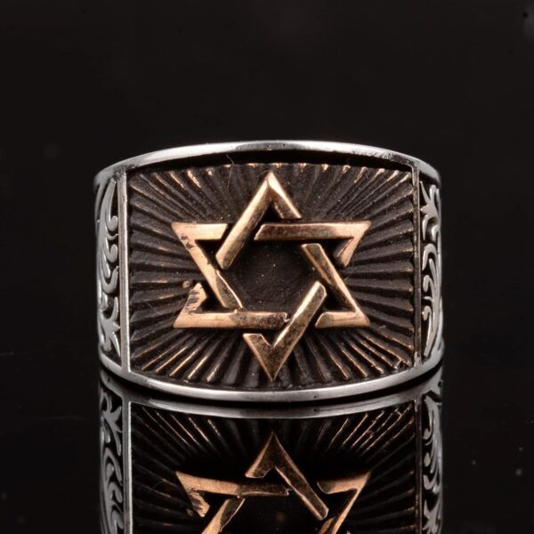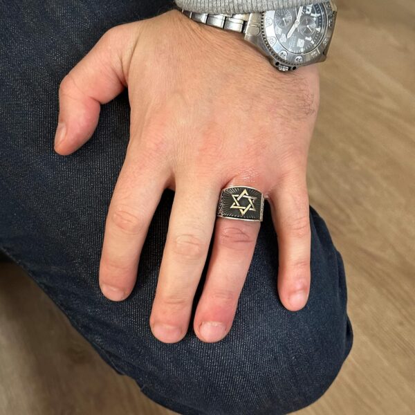 Erkekler için Davut Yıldızı Yüzüğü’nü sunuyoruz; Davut Yıldızı’nın derin kültürel ve manevi anlamını 925 ayar gümüşün zarif işçiliği ile birleştiren etkileyici bir takı parçası. Bu yüzük, tarihi ve manevi anlamı ile tanınan çarpıcı bir Davut Yıldızı sembolü taşımaktadır.