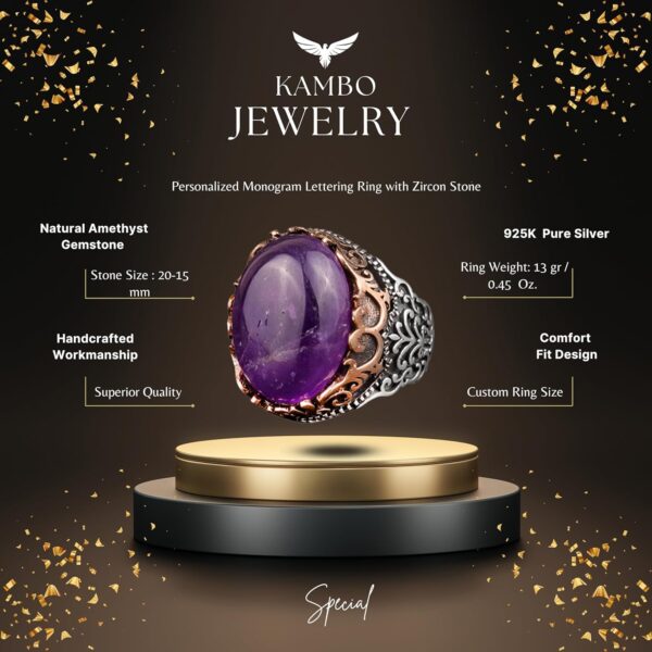 Erkekler için Doğal Ametist Taş Yüzük ile tanışın; ametistin zengin tonlarını 925 ayar gümüşün vintage zarafetiyle bir araya getiren etkileyici bir takı parçasıdır. Bu yüzük, olağanüstü parlaklığı ve derin mor rengi ile tanınan gerçek bir ametist taşına sahiptir.