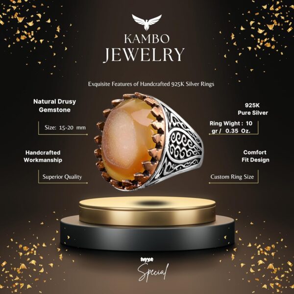 KAMBO Gerçek Doğal Druzy Kristal Kuvars Taş Yüzük Koleksiyonu’nu sunuyoruz; doğal zarafetin ve ustalıkla yapılan işçiliğin bir kanıtı. Göz alıcı Sarı ve yeşil seçenekleriyle sunulan bu gümüş erkek yüzükleri, stil ve özgünlüğün en güzel örneğidir. Her yüzük, benzersiz parıltısı ve zengin dokularıyla bilinen gerçek Druzy Kuvars taşını içermektedir. Kaliteyi önemseyen ve doğal bir ışıltı katmak isteyen seçkin beyefendiler için mükemmel bir seçim. KAMBO farkını benimseyin; gümüşün zamansız çekiciliği ile gerçek taşların canlı güzelliğini bir araya getiren bir parça ile.