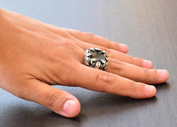 Erkekler için tasarlanmış olan Gümüş Akrep Yüzüğümüzün cesur şıklığını keşfedin; göz alıcı doğal obsidyen taşına sahiptir. Derin siyah rengi ve koruyucu özellikleriyle bilinen obsidyen, dayanıklılığı ve lüks bir görünümü garanti eden yüksek kaliteli 925 ayar gümüş ile işlenmiştir.