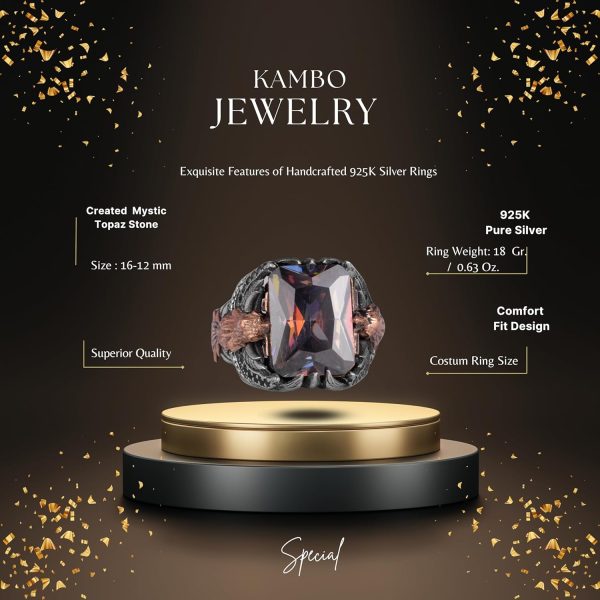 Tasarlanmış mistik topaz taşı, renk yelpazesini yansıtma yeteneği ile tanınır ve ruhsal derinlik ve korumayı simgeler. Direnç ve cesareti temsil eden şahin sembolü ile bir araya geldiğinde, bu yüzük güç ve mistisizmin güçlü bir sembolü haline gelir; günlük kullanım veya özel etkinlikler için mükemmeldir.