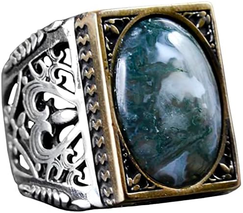 Erkekler için Katı 925 Ayar Gümüş Yüzük, Gerçek Doğal Yosunlu Akik Taşı Yüzük, Vintage Tasarım