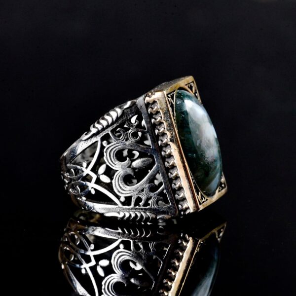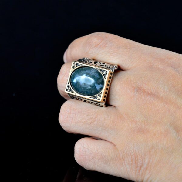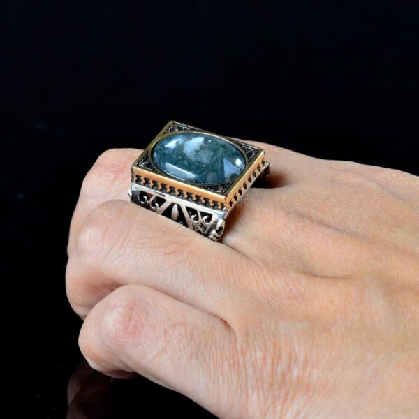 Yüzük, büyümeyi, dengeyi ve istikrarı temsil eden güzel bir doğal yosun akik taşını sergilemektedir. Bu tasarım unsuru, yüzüğün görsel cazibesini artırmakla kalmaz, aynı zamanda taşla ilişkilendirilen olumlu niteliklerin sürekli bir hatırlatıcısı görevi görür.