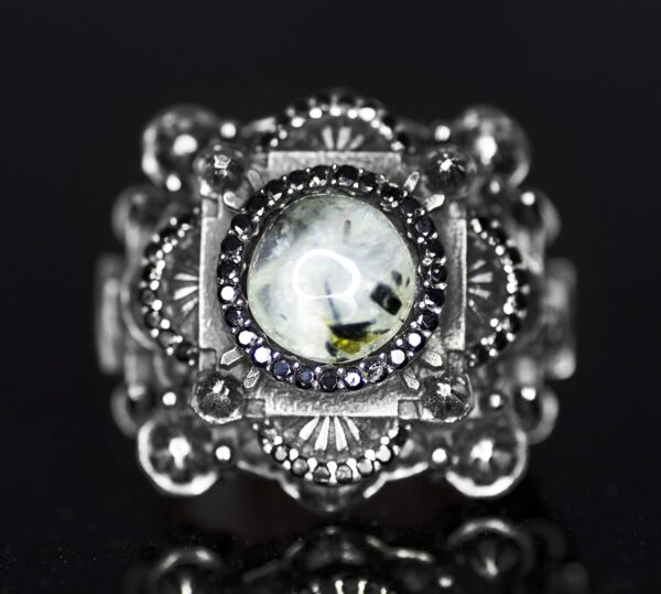 Bu zarif erkek yüzüğü, dayanıklılığı ve şık parlaklığı ile öne çıkan premium 925 ayar gümüşten yapılmıştır. Yüzük, sakinleştirici özellikleri ve güzel yeşil tonları ile bilinen etkileyici bir prehnit yeşil taşı içerir, bu da onu herhangi bir kıyafet için güçlü bir ifade parçası haline getirir.