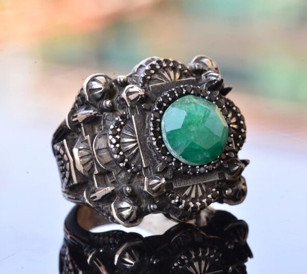 Camii Modelli Erkekler için Lüks 925 Ayar Gümüş Yüzük – Doğal Zümrüt Taşlı – Şık ve Görkemli Tasarım
