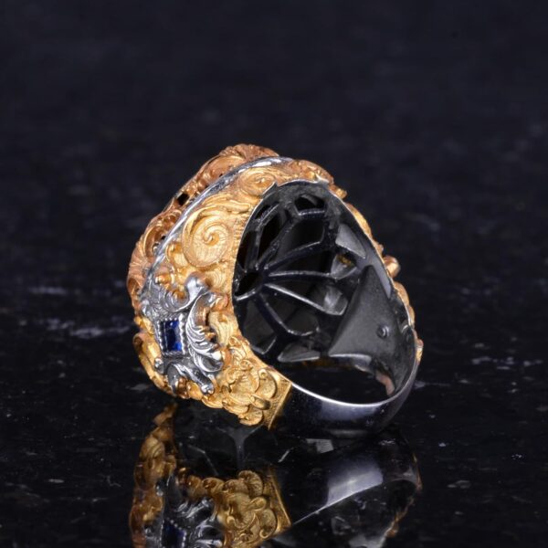 Yüzüğün tasarımı, şık altın kaplama ile zenginleştirilmiştir ve lüks bir görünüm sunar. Karmaşık işçilik ve detaylı oyma işlemleri, bu yüzüğü herhangi bir takı koleksiyonuna öne çıkan bir ek haline getirir.