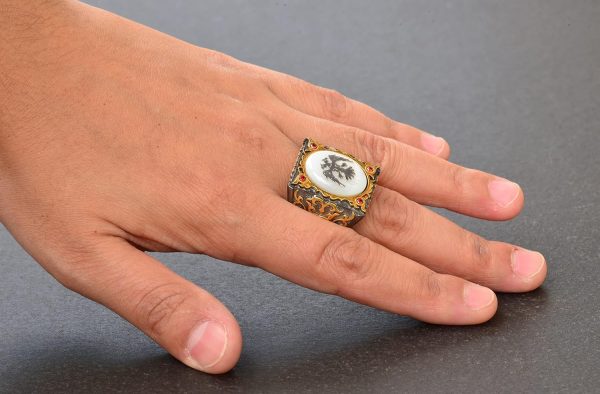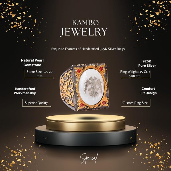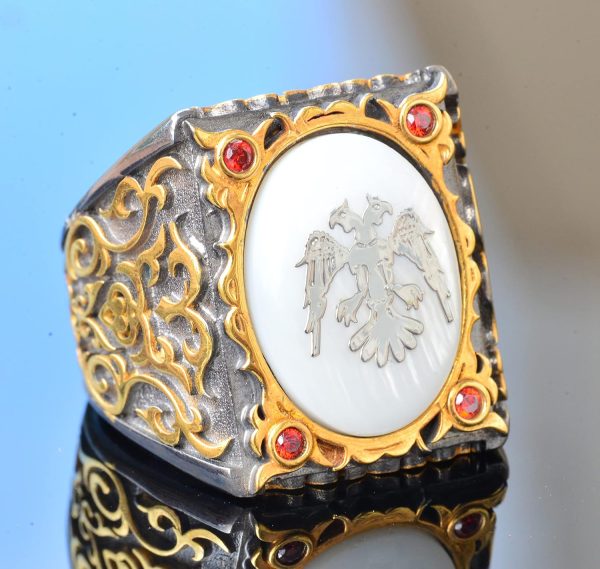 Çift başlı kartal, güç ve mirası simgeler; bu yüzük, herhangi bir takı koleksiyonuna anlamlı bir katkı sağlar. Sultanların estetiğinden ilham alan bu tasarım, herhangi bir kıyafeti mükemmel bir şekilde tamamlayan zarafet ve sofistike bir dokunuş sunar.