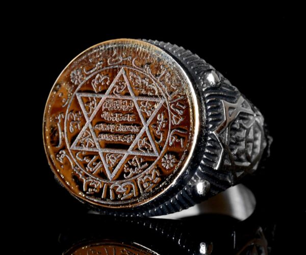 Erkekler için Sterlin Gümüş Yüzük – Davut Yıldızı Tılsımı ile Altın Detaylı Yazılar