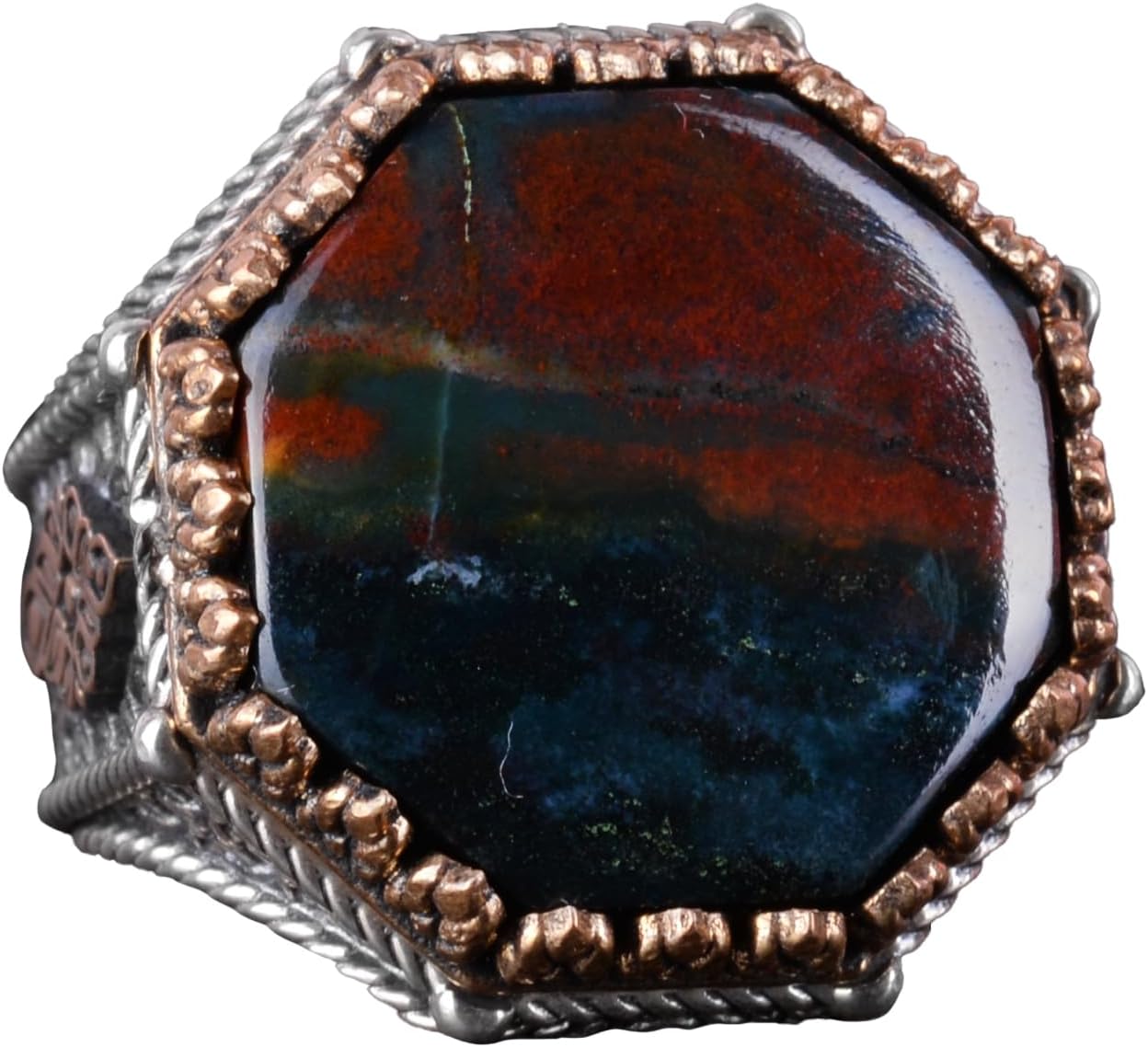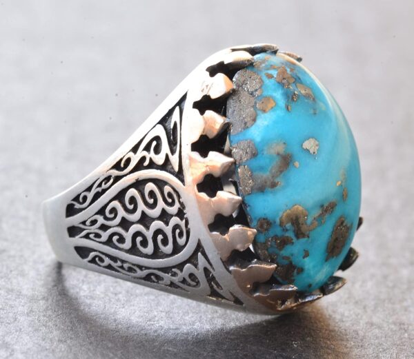Erkekler için tasarlanmış olan Gümüş Yüzüğümüzün zarif şıklığını doğal Arizona turkuazı taşının muhteşem görüntüsüyle deneyimleyin. Canlı mavi rengi ve benzersiz desenleriyle tanınan turkuaz, yüksek kaliteli gümüşte işlenmiştir, bu da dayanıklılık ve lüks bir görünüm sağlar.