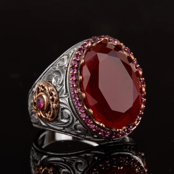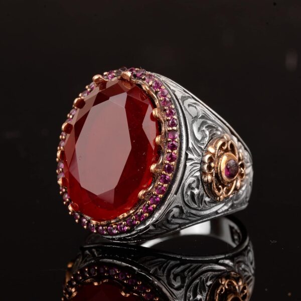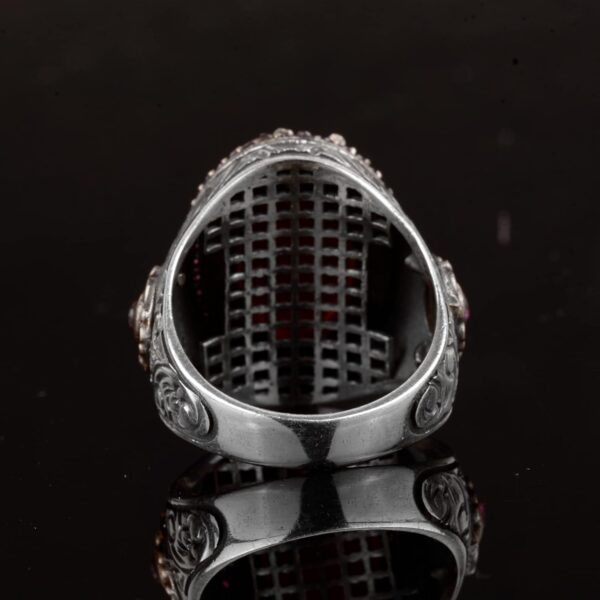 Erkekler için tasarlanmış olan 925 Ayar Gümüş Yüzüğümüzün zarif şıklığını deneyimleyin; göz alıcı bir yapay garnet taşı ile süslenmiştir. Derin kırmızı rengi ve parlaklığı ile bilinen garnet, dayanıklılığı ve lüks bir görünüm sağlayan yüksek kaliteli 925 ayar gümüş üzerine yerleştirilmiştir.