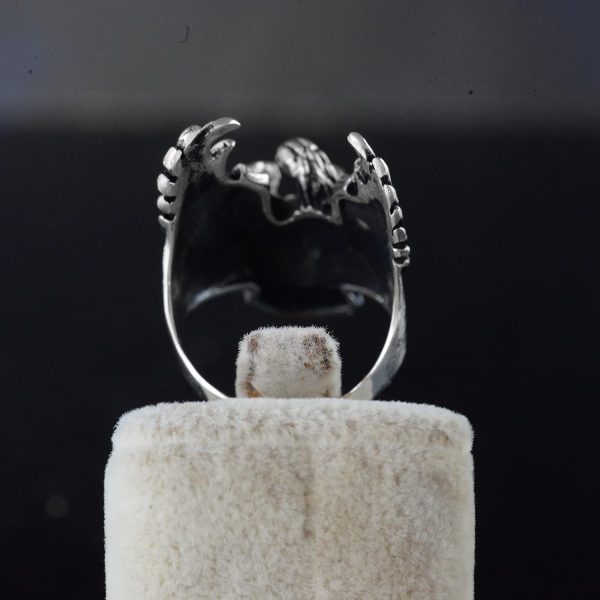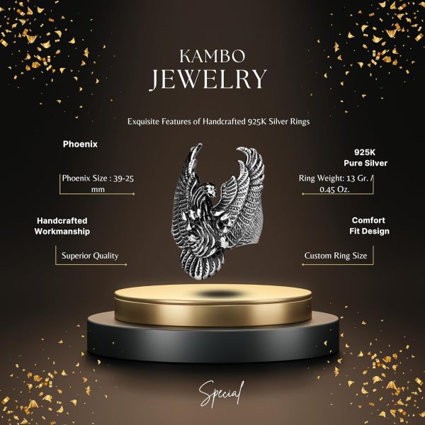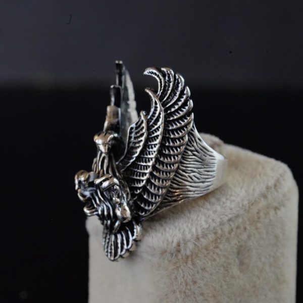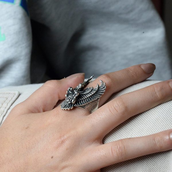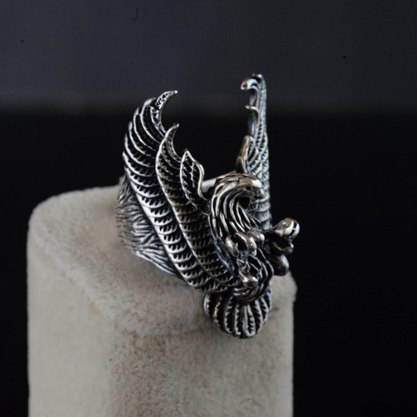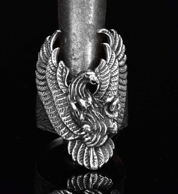 Yüzüğün büyük ve ağır tasarımı, dikkat çekici ve sağlam takıları sevenler için idealdir. Phoenix ve ölüm başı tasarımının benzersiz birleşimi, yeniden doğuşu ve cesareti simgeler, bu da onu herhangi bir mücevher koleksiyonunda öne çıkan bir parça haline getirir.