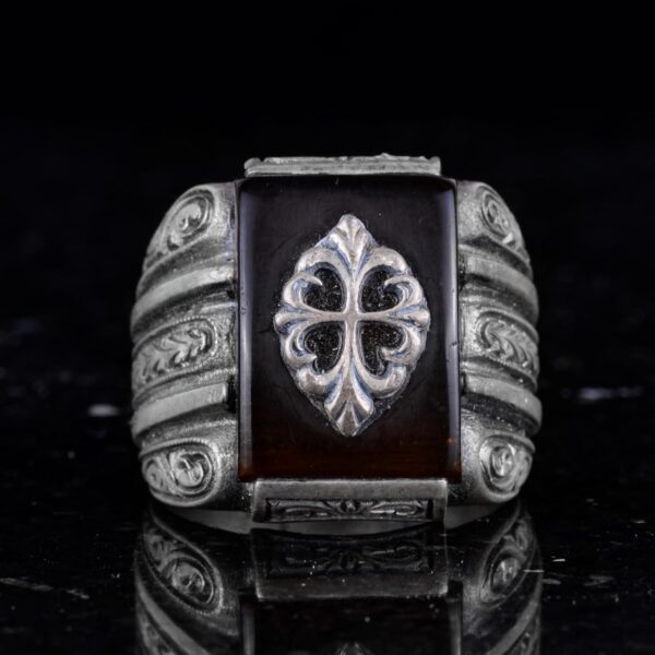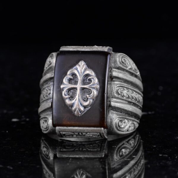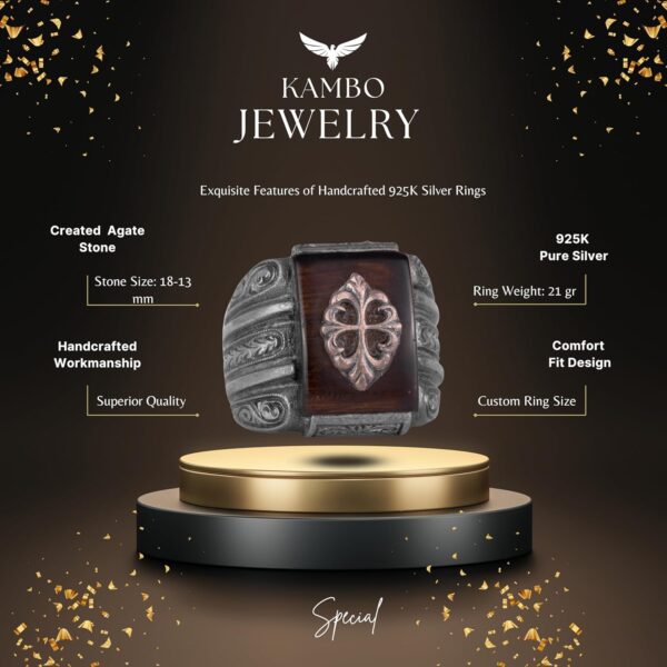 Bu çarpıcı erkek yüzüğü, ince işçilikle hazırlanmış 925 ayar gümüş bir bant üzerinde yer alan üretilmiş bir agat taşı ile dikkat çekiyor. Zengin ve derin renkleriyle bilinen agat, merkezdeki süslü bir amblem ile tamamlanarak parçaya bir katman sofistike ve benzersizlik ekliyor.
