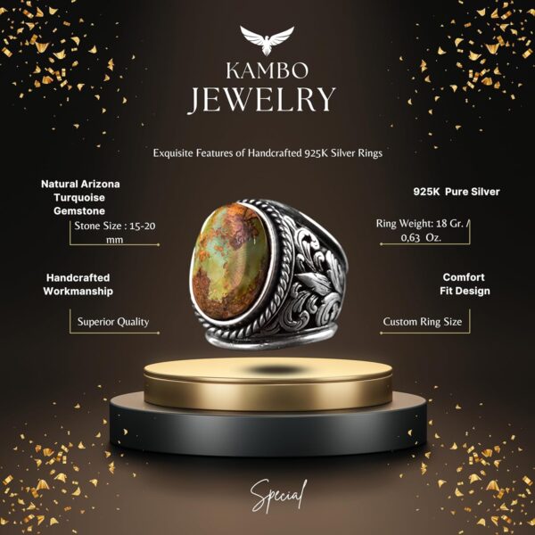Erkekler için Turkuaz Taş Yüzük, canlı turkuaz tonlarını 925 ayar gümüşün modern zarafetiyle birleştiren büyüleyici bir takı parçasıdır. Bu yüzük, eşsiz matrisi ve parlak mavi-yeşil rengiyle tanınan gerçek bir turkuaz taşı içerir.