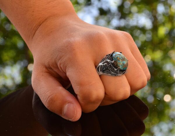 Arizona turkuaz taşlı erkek yüzüğümüz, gerçek taşların ve sanatsal tasarımların güzelliğini takdir edenler için mükemmel, göz alıcı bir el yapımı takıdır. Yüksek kaliteli 925 ayar gümüş ile el yapımı olarak tasarlanan bu yüzük, dayanıklılık ve kalıcı bir parlaklık sağlar. Doğadan ilham alan karmaşık tasarımı ve gerçek doğal Arizona turkuaz taşı, zarafet katmakta ve her takı koleksiyonuna benzersiz bir ek yapmaktadır.