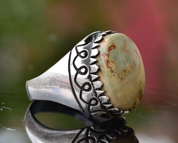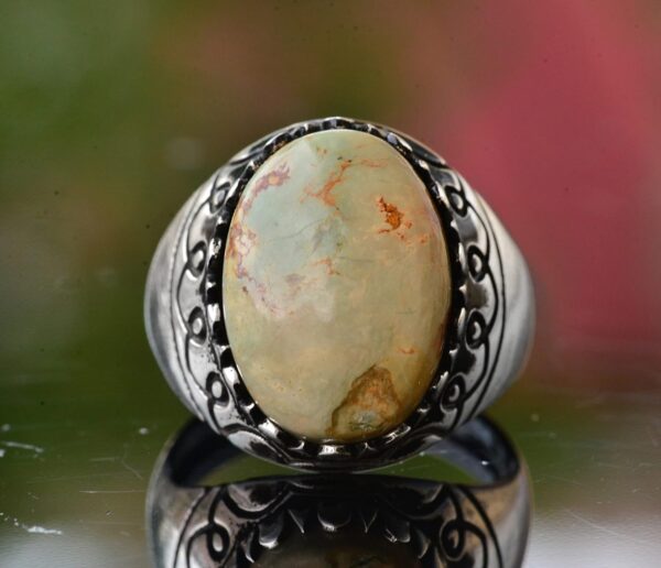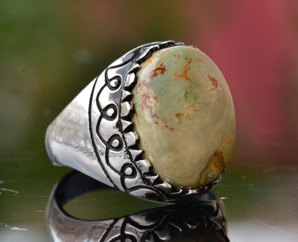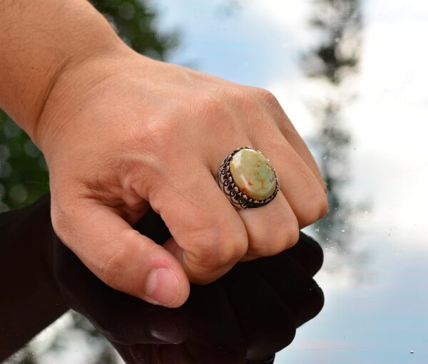 Yüzük, canlı rengi ve benzersiz doğal desenleri ile tanınan gerçek bir yeşil Arizona Turkuaz taşına sahiptir, bu da her parçayı gerçekten eşsiz kılar. Zamansız tasarımı, gündelik ya da resmi herhangi bir etkinlik için uygundur.