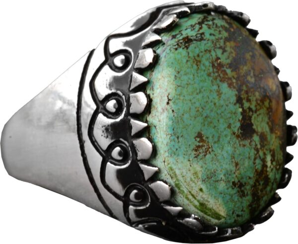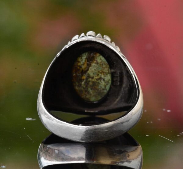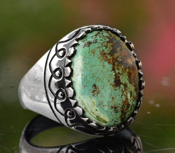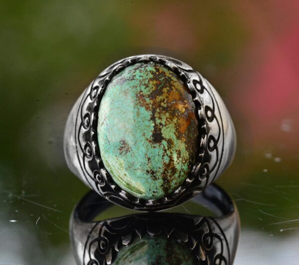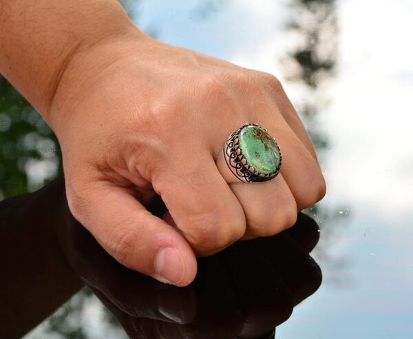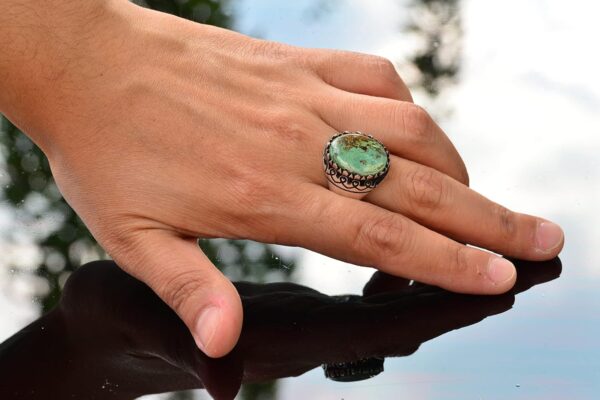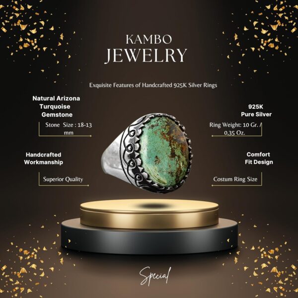 Yüzük, canlı rengi ve benzersiz doğal desenleriyle bilinen gerçek bir yeşil Arizona Turkuaz taşı ile süslenmiştir ve bu da her parçayı gerçekten eşsiz kılar. Zamansız tasarımı, hem günlük hem de resmi her türlü etkinlik için uygundur.