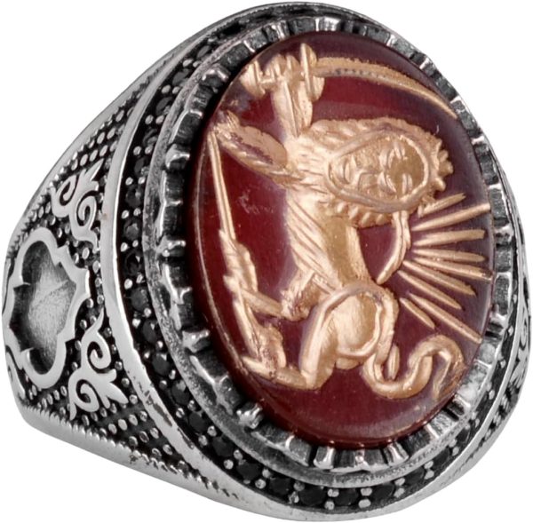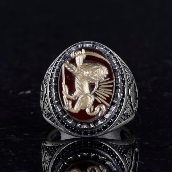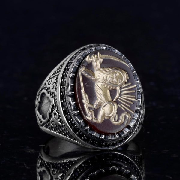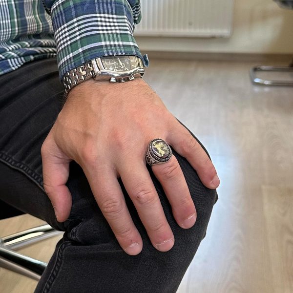 Oyma ve Oymalı Tasarım: Bu yüzük, yetenekli zanaatkarlar tarafından titizlikle el yapımı olarak üretilmiştir. Detaylı bir aslan oyması ve oyması içermektedir. Bu karmaşık sanat eseri, yüzüğe benzersiz ve sanatsal bir dokunuş katmakta, onu gerçek bir başyapıt haline getirmektedir.