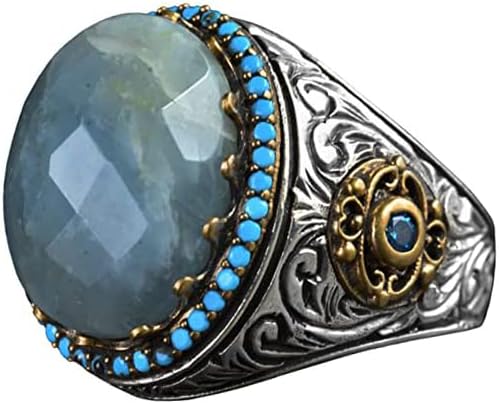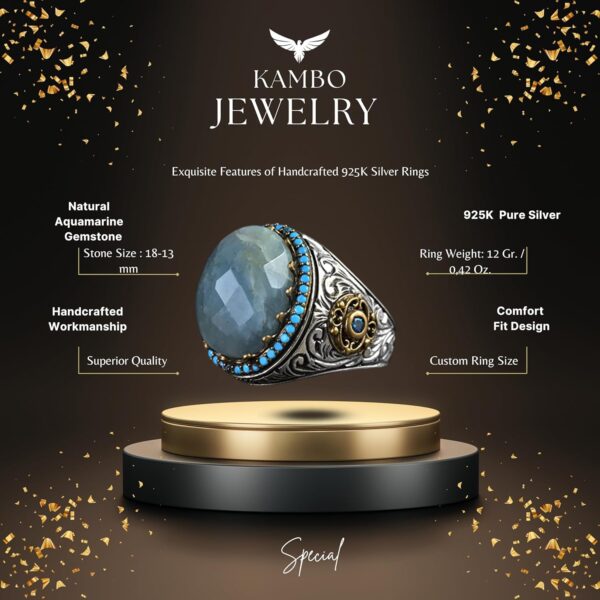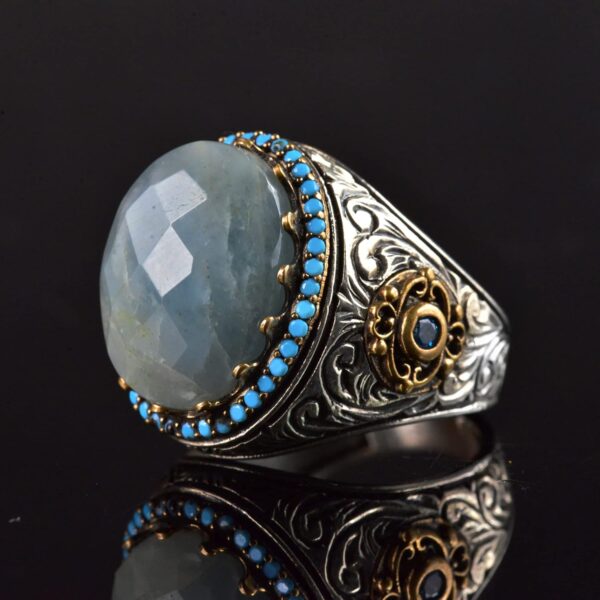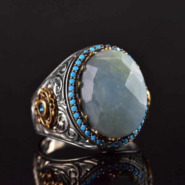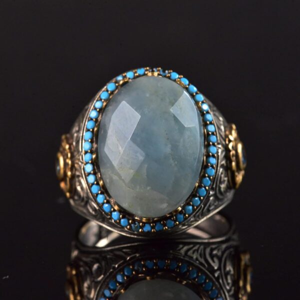 Gerçek Doğal Akvamarin Taş Yüzük, El Yapımı Turkuaz Aksamlar, 925 Ayar Gümüş Erkek Yüzük