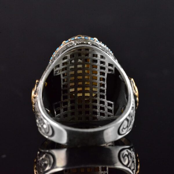 GÜZEL TURKUAZ AKSESUARLAR: Yüzük, sofistike tasarımına canlı ve renkli bir dokunuş ekleyen göz alıcı turkuaz aksanlarla süslenmiştir. Bu aksanlar, genel çekiciliği artırarak, benzersiz ve dikkat çekici takıları takdir edenler için mükemmel bir seçim yapmaktadır.