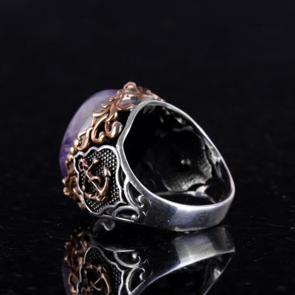 Gerçek Doğal Ametist Taşlı Yüzük, 925 Ayar Katı Gümüş Yüzük, Denizci Çapa Gümüş Yüzük