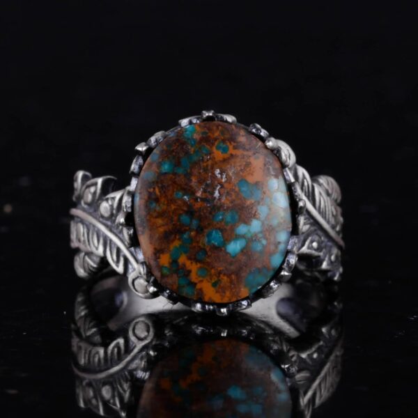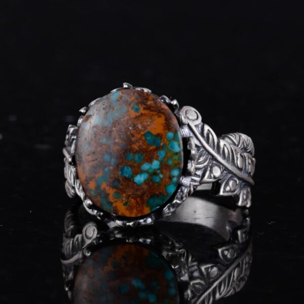 Bu göz alıcı 925 ayar gümüş yüzük ile doğal Arizona Turkuaz’ın zarafetini deneyimleyin. Yüzük, canlı mavi-yeşil rengi ve benzersiz matris desenleri ile tanınan, güzelce parlatılmış gerçek Arizona Turkuaz taşına sahiptir. Doğal taşlara değer verenler için mükemmel olan bu yüzük, özel oyması ve karmaşık tasarımıyla her kıyafete benzersiz bir dokunuş katmaktadır.