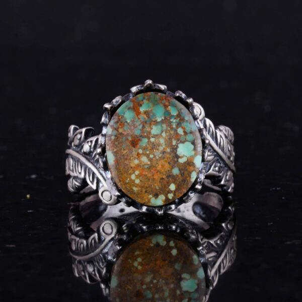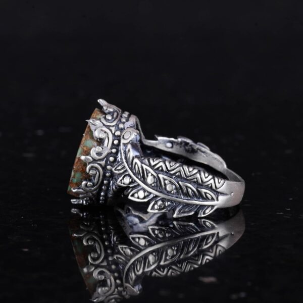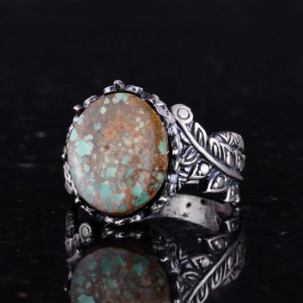 Bu muhteşem 925 ayar gümüş yüzük ile doğal Arizona Turkuaz’ın zarafetini yaşayın. Yüzük, canlı mavi-yeşil rengi ve benzersiz matris desenleri ile bilinen güzelce parlatılmış gerçek Arizona Turkuaz taşını içermektedir. Doğal taşları sevenler için mükemmel olan bu yüzük, özel oyması ve karmaşık tasarımı ile her kıyafete eşsiz bir dokunuş katmaktadır.