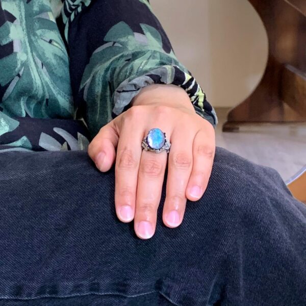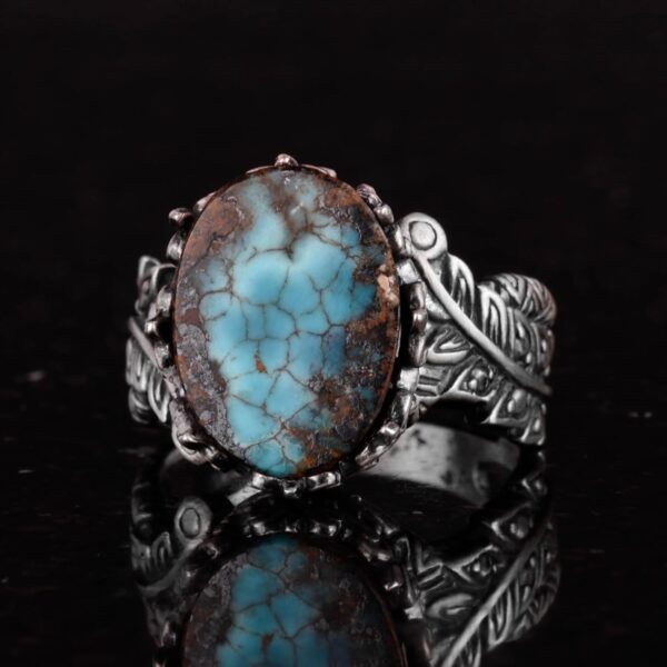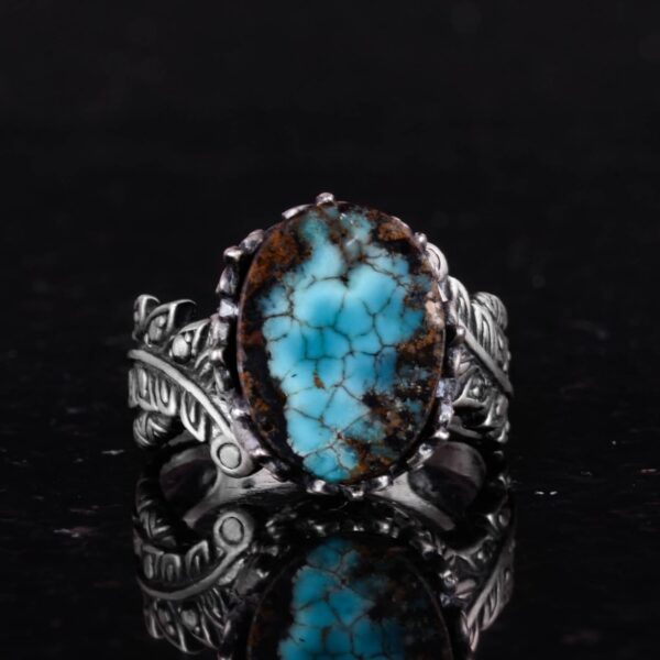 Bu muhteşem 925 ayar gümüş yüzük ile doğal Arizona Turkuaz’ın zarafetini deneyimleyin. Yüzük, canlı mavi-yeşil rengi ve benzersiz matris desenleri ile bilinen, güzelce parlatılmış gerçek Arizona Turkuaz taşını içermektedir. Doğal taşları sevenler için mükemmel olan bu yüzük, özel gravürü ve karmaşık tasarımıyla her kıyafete eşsiz bir dokunuş katmaktadır.