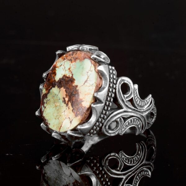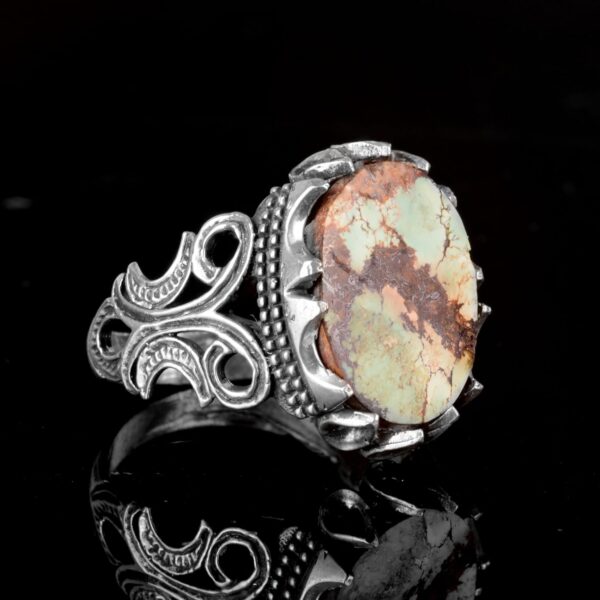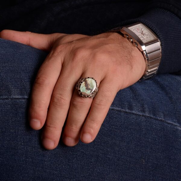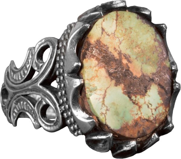 Bu zarif yüzük, yüksek kaliteli 925K gümüşten yapılmış olup gerçek bir Arizona turkuaz taşını sergilemektedir. Taş, canlı renkleri ve karmaşık matris yapısıyla değerli bir parça haline gelmekte, her bir yüzüğü benzersiz bir sanat eseri yapmaktadır. El yapımı tasarımı, Turkuaz’ın doğal güzelliğini daha da vurgulayarak, hiçbir yüzüğün birbirine benzememesini sağlamaktadır.