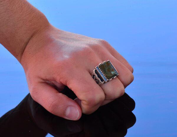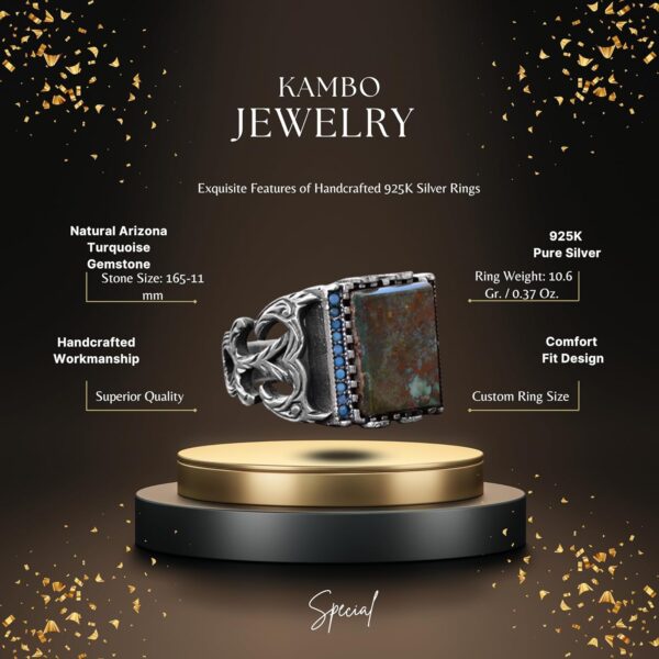 Gerçek doğal Arizona turkuaz taşını ve özelleştirilmiş tasarımını içeren erkek yüzüğümüz, benzersiz ve kişiselleştirilmiş tasarımların güzelliğini takdir edenler için mükemmel bir takı parçasıdır. Yüksek kaliteli 925 ayar gümüş ile el yapımı olan bu yüzük, dayanıklılık ve kalıcı bir parlaklık sağlar. Gerçek Arizona turkuaz taşı, benzersiz mavi-yeşil rengi ile dikkat çeker ve iyileştirici özellikleri ile bilinir.