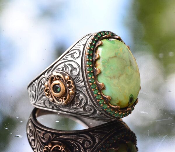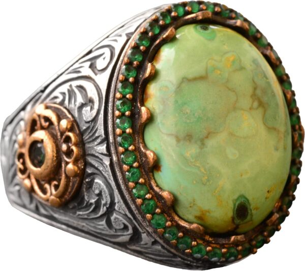 Arizona turkuaz taşlı erkek yüzüğümüz, gerçek taşların güzelliğini takdir edenler için mükemmel bir el yapımı mücevher parçasıdır. Yüksek kaliteli 925 ayar saf gümüşten el işçiliği ile üretilen bu yüzük, dayanıklılık ve kalıcı bir parlaklık sağlar. Karmaşık tasarımı ve gerçek 8.55 karat doğal Arizona turkuaz taşı, her mücevher koleksiyonuna eşsiz bir zarafet katmaktadır.