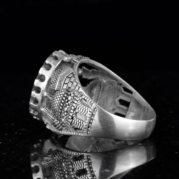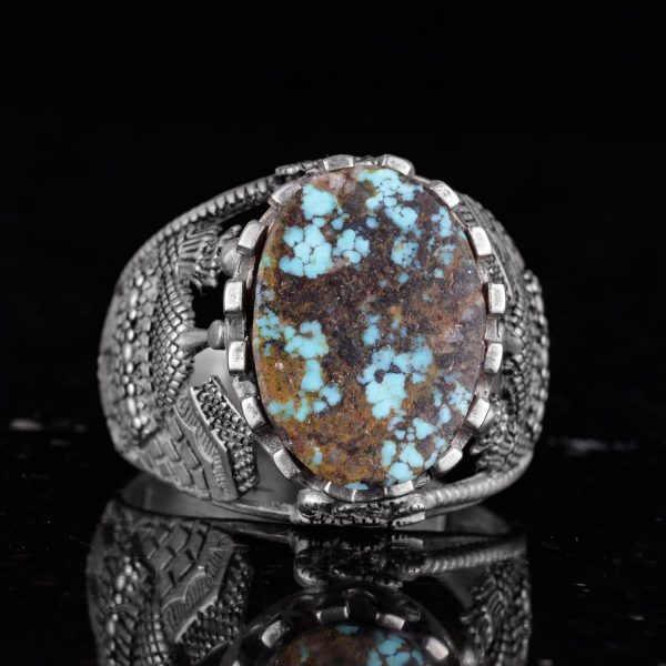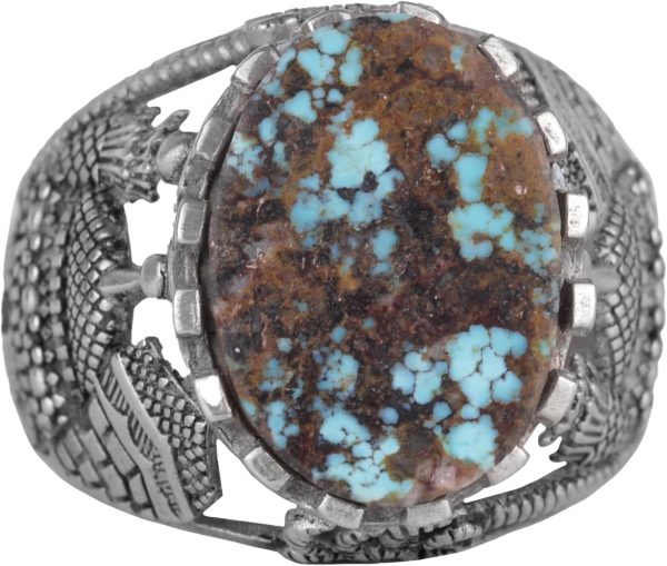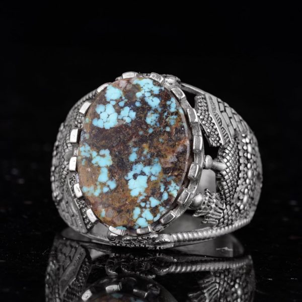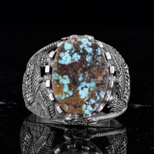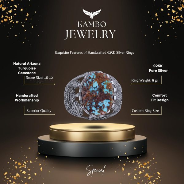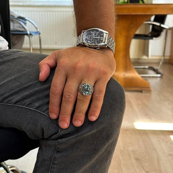 Bu muhteşem yüzük, özenle işlenmiş 925 ayar gümüş bir bant üzerine yerleştirilmiş etkileyici bir doğal Arizona turkuaz taşı sergilemektedir. Karmaşık tasarımı, bu parçayı sadece bir stil ifadesi değil, aynı zamanda bir inanç sembolü haline getirerek manevi bir dokunuş katmaktadır.