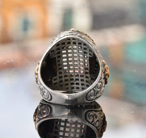 Premium 925 ayar katı gümüşten üretilen bu yüzük, dayanıklılığı zarif ve zamansız bir tasarımla birleştirir. Ayrıntılı desenler ve asil tasarım unsurları, bu yüzüğe bir sofistike dokunuş katıyor ve onu herhangi bir takı koleksiyonunda öne çıkan bir parça haline getiriyor.