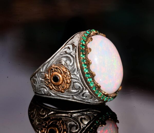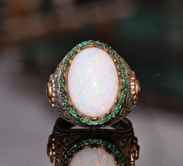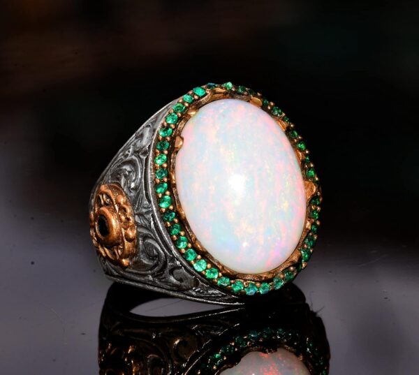 Gerçek Doğal Avustralya Opal Taş Yüzüğümüzün büyüleyici güzelliğini deneyimleyin. 7.55 karatlık olağanüstü doğal Avustralya opali ile bu yüzük gerçek bir başyapıt. Renk oyunlarıyla bilinen opal taşı, büyüleyici bir renk yelpazesi sunarak ona bakan herkesin dikkatini çekiyor.