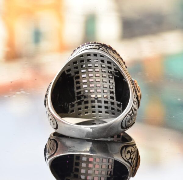 Yüksek kaliteli katı gümüşten üretilen bu yüzük, dayanıklılığı zarif ve zamansız bir tasarım ile birleştirir. Ayrıntılı desenler ve görkemli tasarım unsurları, bu yüzüğe bir dokunuş zarafet katmakta ve onu her takı koleksiyonunda dikkat çekici bir parça haline getirmektedir.