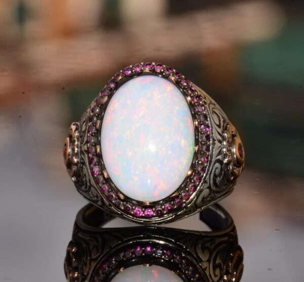 Gerçek Doğal Avustralya Opal Taşı Yüzüğümüzün büyüleyici güzelliğini keşfedin. 7.55 karatlık etkileyici bir doğal Avustralya opali ile tasarlanan bu yüzük, gerçek bir başyapıttır. Canlı renk oyunu ile bilinen opal taşı, büyüleyici bir renk yelpazesi sergileyerek ona bakan herkesi kendine hayran bırakır.