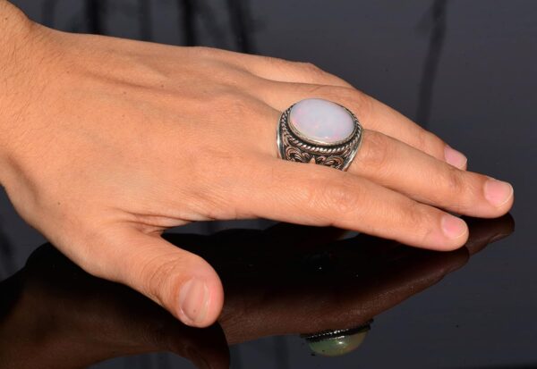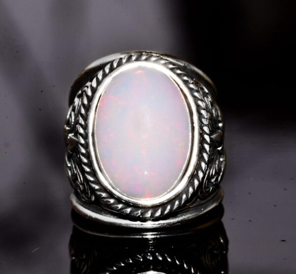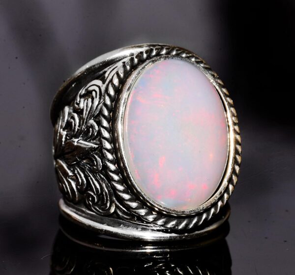 Ayrıntılı tasarım detayları, opalın doğal güzelliğini vurgulamakta ve bu yüzüğü hem gündelik hem de resmi etkinlikler için mükemmel bir parça haline getirmektedir. İster günlük olarak ister özel günlerde takılsın, bu yüzük, kusursuz zevkinizin ve ince zanaatkarlığa olan takdirinizin sürekli bir hatırlatıcısıdır.