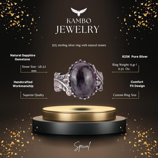 925 Ayar Gümüş Kadın Yüzük, Gerçek Doğal Cabochon Safir Taşı, Vintage Bohem Tasarım