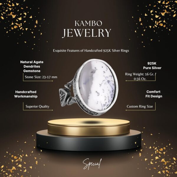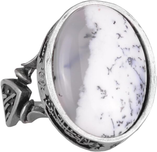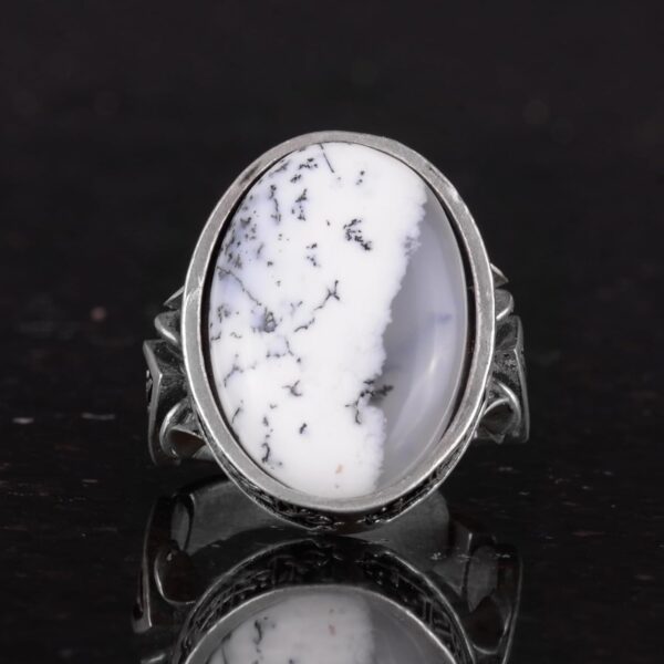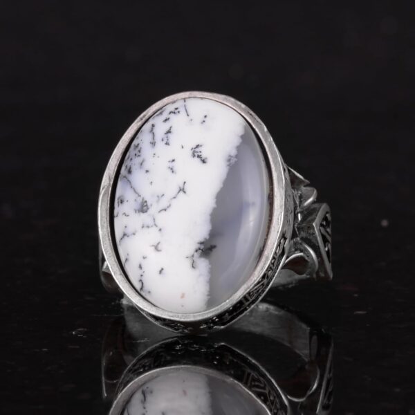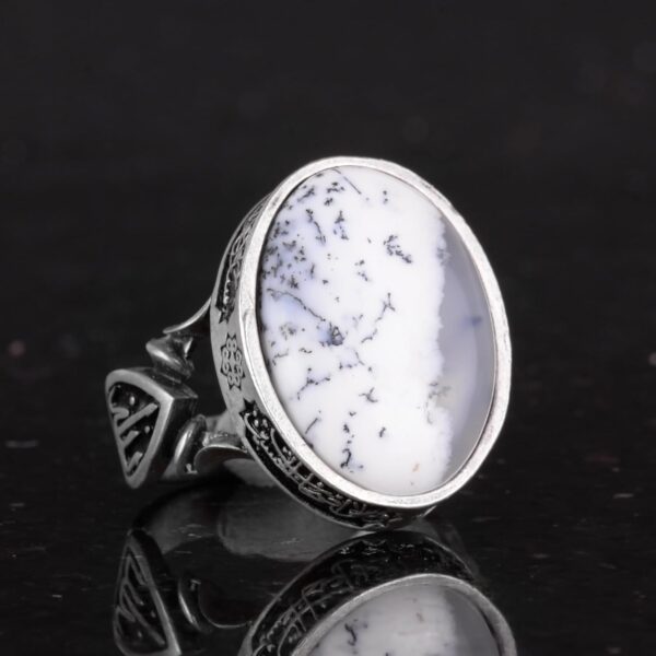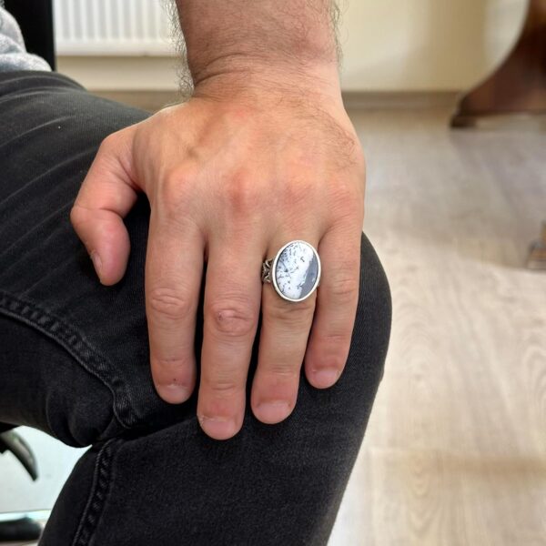 Doğal Dendritik Agat Taşı ile yapılan erkek yüzüğümüz, 925 ayar gümüş ile titizlikle el yapımı olarak üretilmiştir ve kalitesini ve şıklığını uzun süre korumasını sağlar. Her yüzük, büyüme ve korumayı simgeleyen doğal dendritik agat taşı ile süslenmiştir.