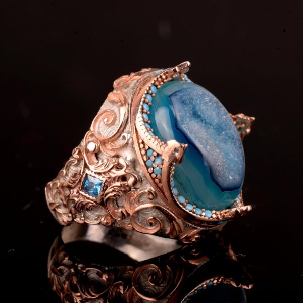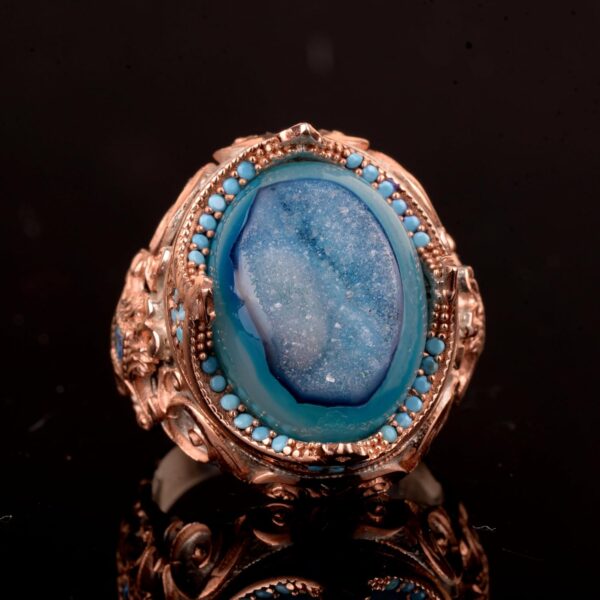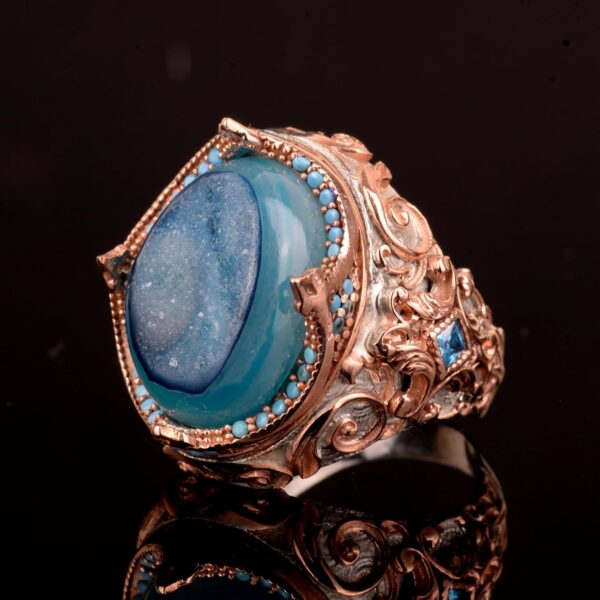 Gerçek Doğal Druzy Kristal Kuvars Taş Yüzük, 925 Ayar Gümüş Yüzük, Eşsiz Yüzük Ağırlığı: 19.82 Gram, Taş Boyutu: 15-20 mm