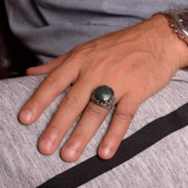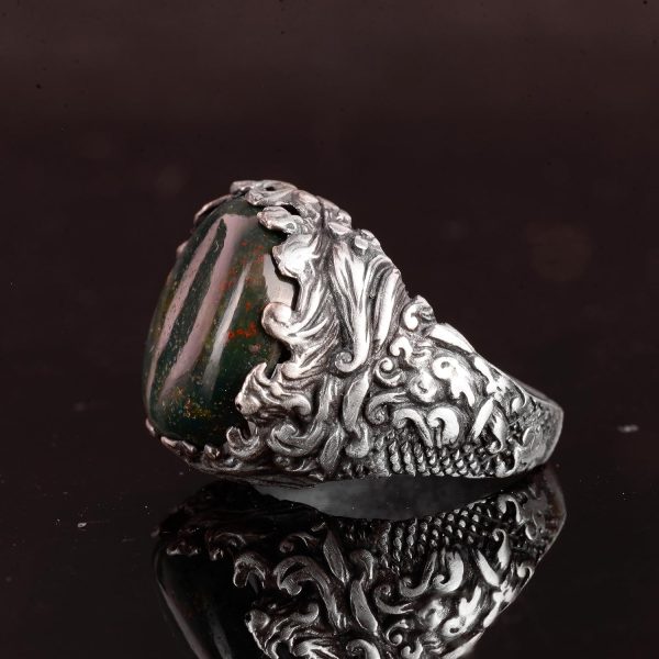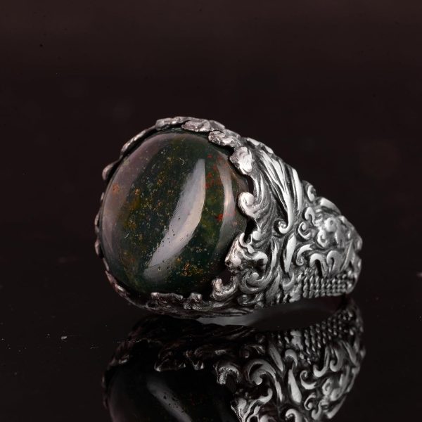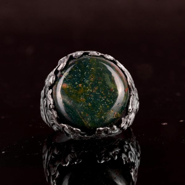 Bu yüzük, kan taşının doğal güzelliğini sergileyen güçlü bir aksesuardır. Eşsiz desenleri ve renkleri, her yüzüğü benzersiz kılar; doğal taşların özgünlüğünü takdir eden erkekler için mükemmeldir.