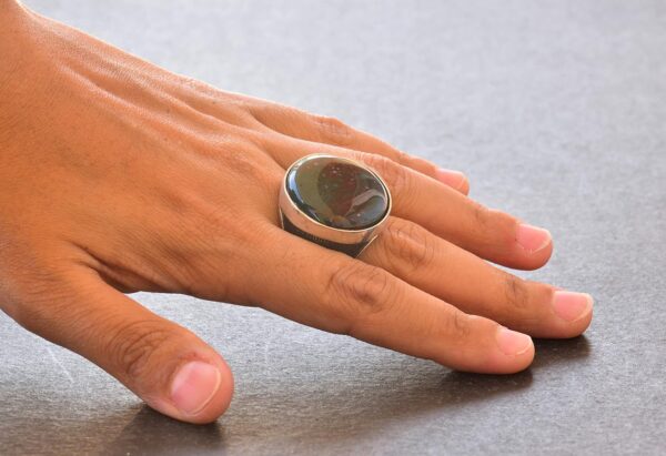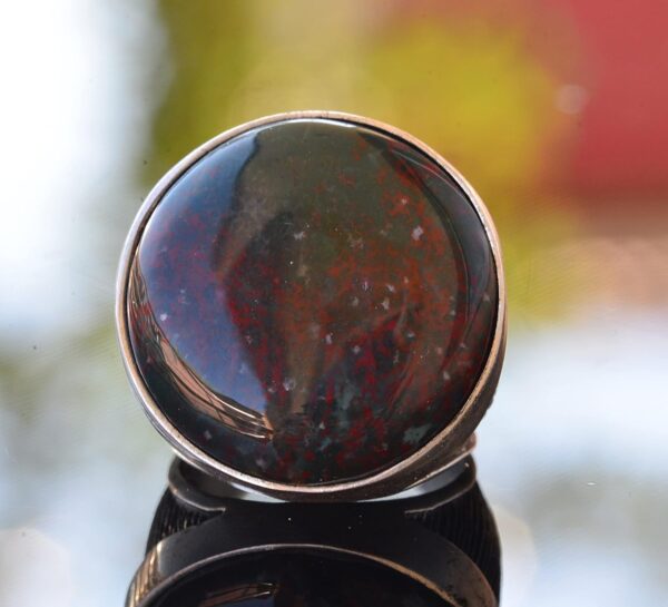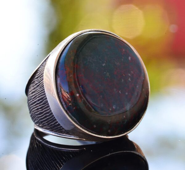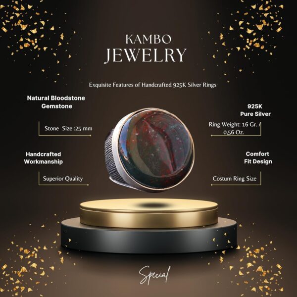 Yüzük, eşsiz derin yeşil rengi ve kırmızı benekleri ile ünlü gerçek büyük yuvarlak Kan Taşı taşına sahiptir. Her yüzük, Kan Taşı’nın doğal güzelliğini ve belirgin özelliklerini sergilemek için ustalıkla el yapımıdır.
