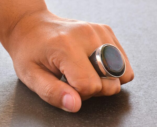 Gerçek Doğal Kan Taşı Yüzüğümüz ile zarafet ve gücün mükemmel birleşimini deneyimleyin. Bu eşsiz parça, dayanıklılığı ve her tarza uyum sağlayan şık bir görünüm sunan yüksek kaliteli katı gümüşten üretilmiştir.