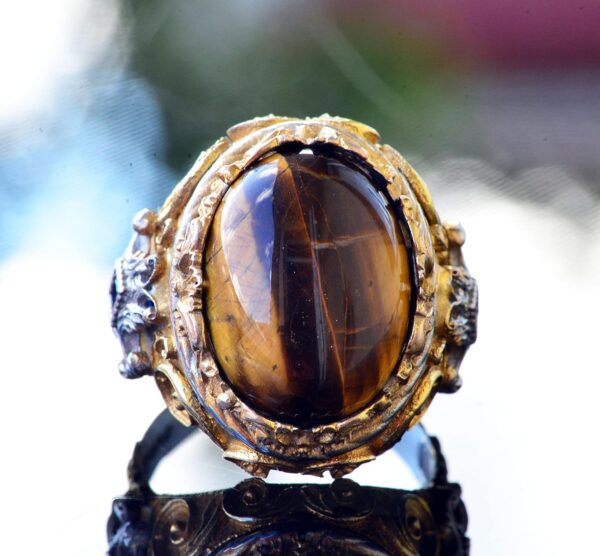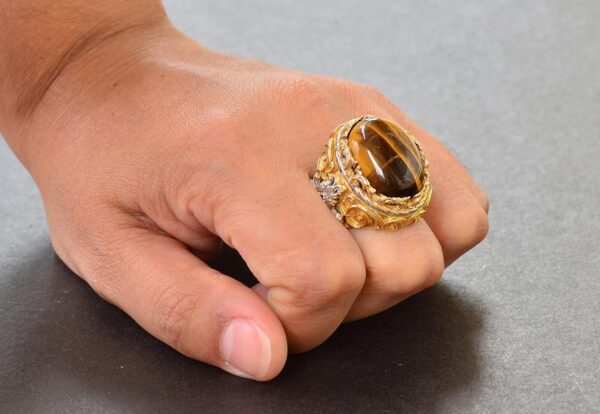 Bu zarif yüzük, yüksek kaliteli 925 Gümüş’ten özenle üretilmiştir ve lüks bir altın kaplama ile tamamlanmıştır. Ortasında, büyüleyici chatoyancy’si ve zengin altın-kahverengi tonlarıyla tanınan etkileyici bir doğal Kaplan Gözü taşı bulunmaktadır. Eşsiz tasarımı ve kaliteli malzemeleri ile bu yüzük, her takı koleksiyonunda öne çıkan bir parça haline gelmektedir.