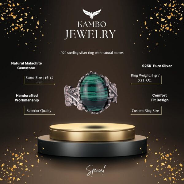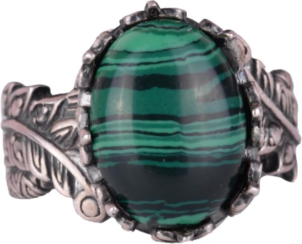 Malakit, negatif enerjileri emdiğine ve olumlu değişimi teşvik ettiğine inanılan bir dönüşüm ve koruma taşır. Bu, yüzüğü sadece dikkat çekici bir aksesuar değil, aynı zamanda güç ve yenilenmenin anlamlı bir sembolü haline getirir. Vintage tasarımı, benzersiz bir sanatsal dokunuş ekleyerek el yapımı, eşsiz takılara aşık olanlar için mükemmel bir seçim olmasını sağlar.